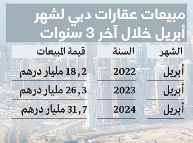حقق القطاع العقاري في دبي، خلال أبريل الماضي، أعلى أداء شهري له على الإطلاق، بعد تسجيل مبيعات بقيمة 31.73 مليار درهم، مسجلاً نمواً نسبته نحو 20.6% مقارنة بمبيعات بلغت 26.3 مليار درهم في أبريل 2023، وذلك بحسب رصد لـ«الإمارات اليوم»، استناداً إلى بيانات دائرة الأراضي والأملاك في دبي.