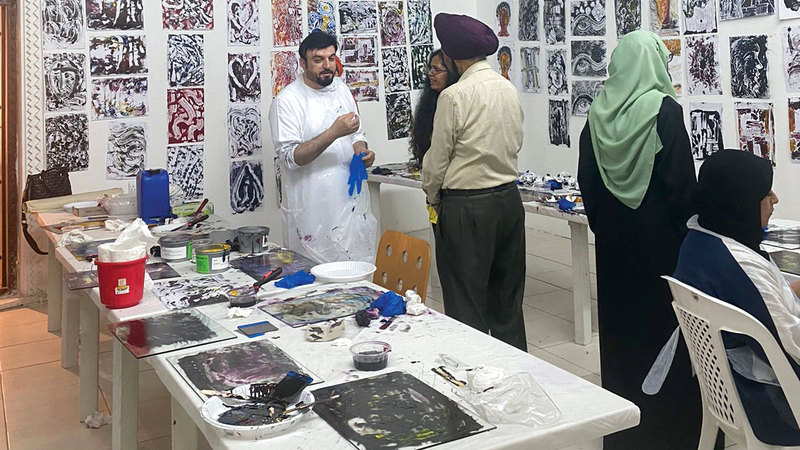 جانب من ورشة الفنان خالد البنّا التي حملت عنوان «الطباعة الأحادية». من المصدر