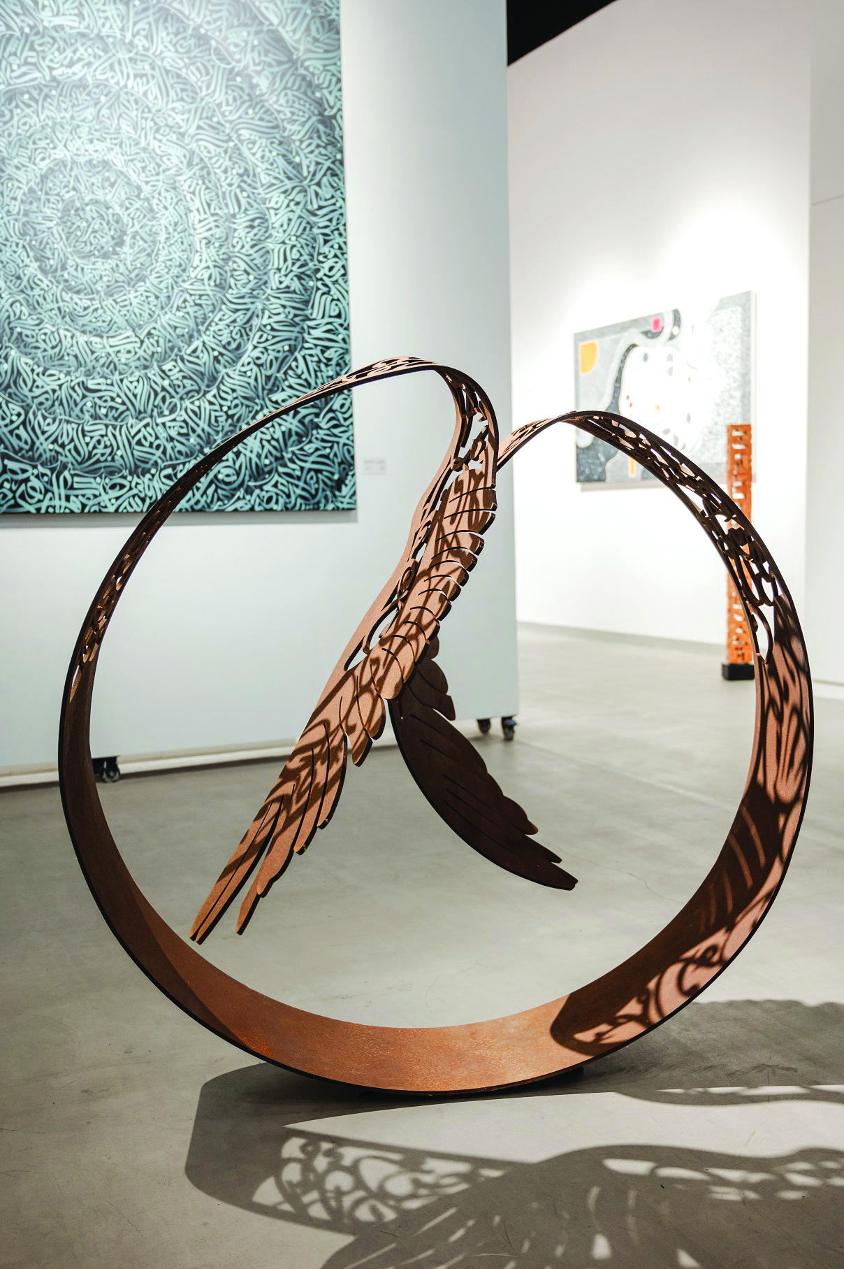 أما الفنانة عزة القبيسي فاستلهمت منحوتتها «أجنحة الحكمة» من تكوين طائر الصقر الذي يعد عنصراً حيوياً في التراث المحلي، ويشكل العمل احتفاءً بالثقافة الإماراتية ويبرز اهتمامها بفن الخط.