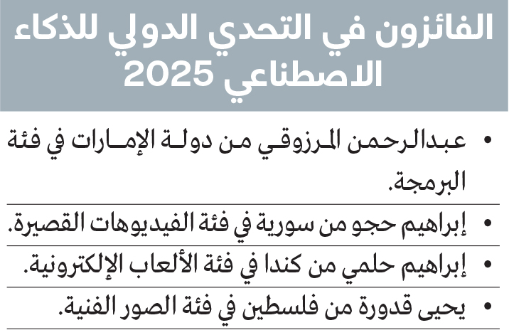 وتضم قائمة الفائزين بالتحدي البالغة قيمة جوائزه الإجمالية مليون درهم: يحيى قدورة من فلسطين في فئة الصور الفنية، وهو مصمم معماري ومدير مشارك في شركة أتكينز، وإبراهيم حجو من سورية في فئة الفيديوهات القصيرة وهو صانع أفلام، وعبدالرحمن المرزوقي من دولة الإمارات في فئة البرمجة، وهو طالب ماجستير علوم التعلم الآلي في جامعة محمد بن زايد للذكاء الاصطناعي، وإبراهيم حلمي من كندا في فئة الألعاب الإلكترونية وهو مهندس في الحلول السحابية والبيانات والذكاء الاصطناعي.