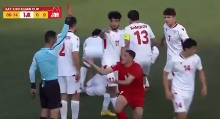 وتعود الواقعة إلى لحظات من إطلاق صافرة بداية المباراة، حيث شهدت تدخل لاعب منتخب الأردن الكلبوني على أحد لاعبي منتخب طاجيكستان، برفع قدمه عاليا للحاق بكرة، لكنها اصطدمت بوجه منافسه، ولم يتردد الحكم، الذي كان قريبا من إشهار البطاقة الحمراء في وجه لاعب منتخب الأردن بعد 5 ثوان فقط من بدايتها، وأصبح اللاعب واحدا من أسرع 10 لاعبين يتم طردهم في تاريخ كرة القدم، بفارق ثوان قليلة عن متصدري القائمة.