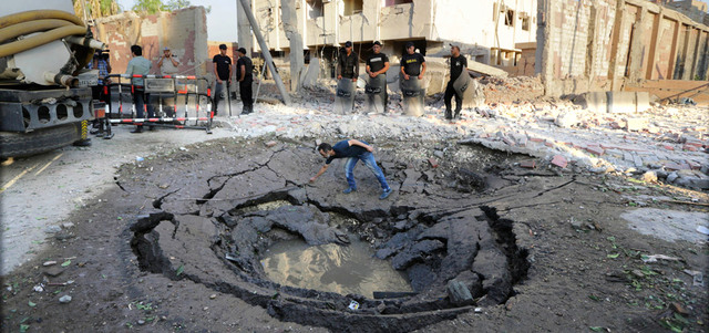 موقع التفجير الإرهابي الذي استهدف مقر الأمن الوطني قرب القاهرة. أ.ب