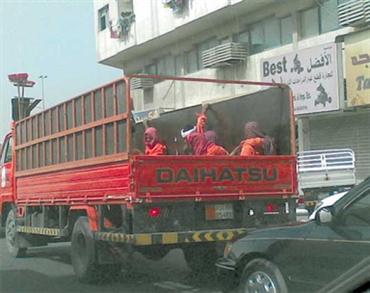 حمل قائد مركبة نقل كبيرة عدداً من العمال فيها، على الرغم من عدم سماح القانون بنقل عمال في مثل هذه السيارات، ما يشكّل خطورة على حياتهم، لذا لابد أن تُراقب هذه المركبات من قبل الجهات المختصة لضبط السائقين ومخالفتهم.