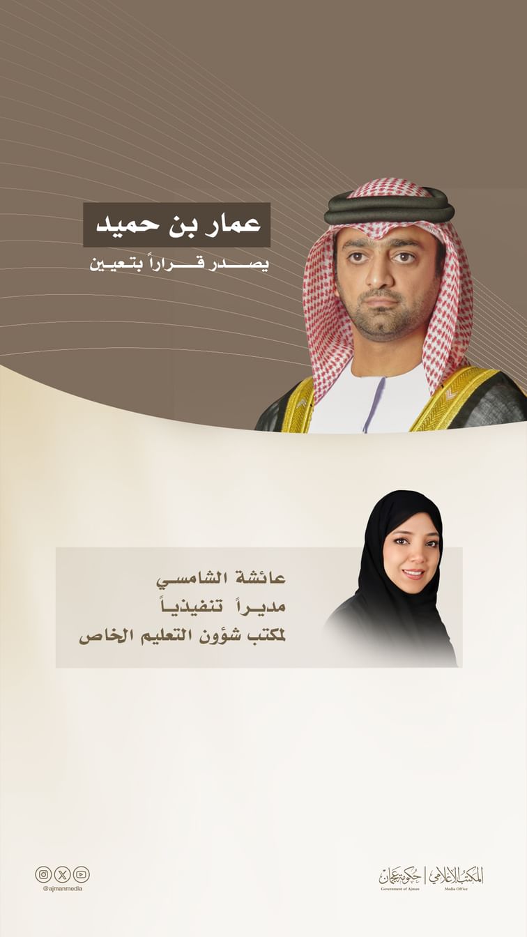 أصدر سمو الشيخ عمّار بن حميد النعيمي، ولي عهد عجمان، رئيس المجلس التنفيذي، قراراً بتعيين عائشة سلطان ماجد الشامسي، مديراً تنفيذياً لمكتب شؤون التعليم الخاص بعجمان.