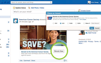 طرحت شركة «فيس بوك» ميزة جديدة يُسمح بموجبها للمُستخدمين بالتبرع بمبالغ نقدية لمصلحة بعض المُنظمات غير الربحية، وذلك عبر شبكتها الاجتماعية الشهيرة. وتدعم الميزة الجديدة ظهور زر يحمل اسم Donate Now، وذلك في صفحات ومُشاركات 18 مُنظمة غير ربحية، منها: الصليب الأحمر، واليونيسيف، والصُندوق العالمي للطبيعة WWF، وبرنامج الأغذية العالمي WFP.