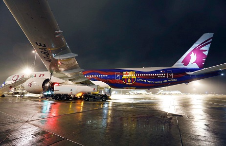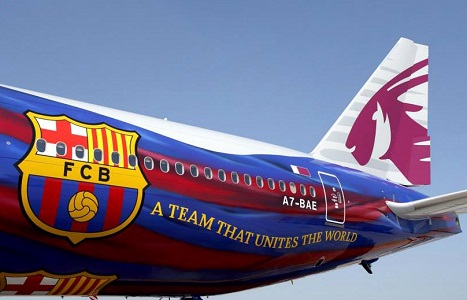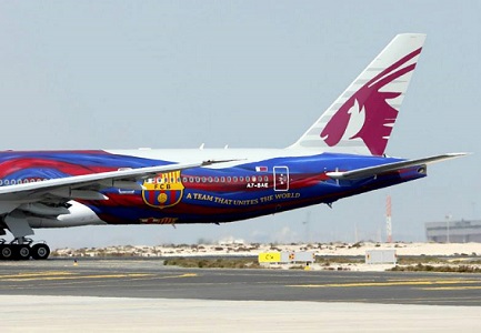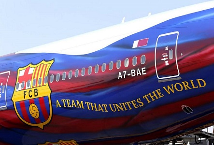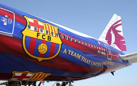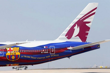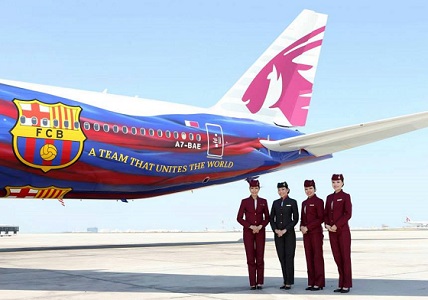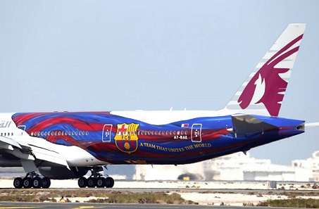 قامت الخطوط الجوية القطرية بتزيين ناقلاتها، من فئة بوينغ 777-300 إي آر، بشعار نادي كرة القدم الأسباني "برشلونة"، وذلك لكونها الراعي الرسمي للفريق، حيث يحمل قميص الفريق شعار القطرية للطيران (QatarAirways).