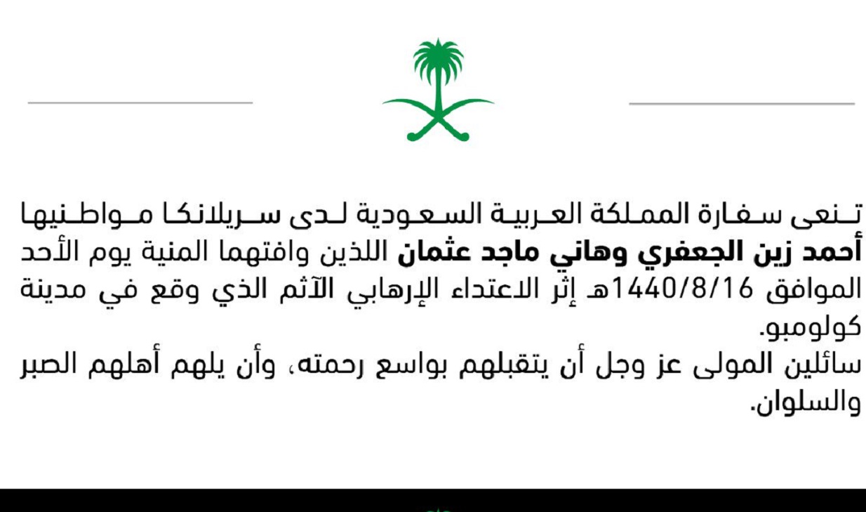 نعت الخطوط الجوية السعودية اليوم، المواطنين أحمد زين الجعفري، وهاني ماجد عثمان، اللذان توفيا إثر الاعتداءات الإرهابية في سريلانكا.