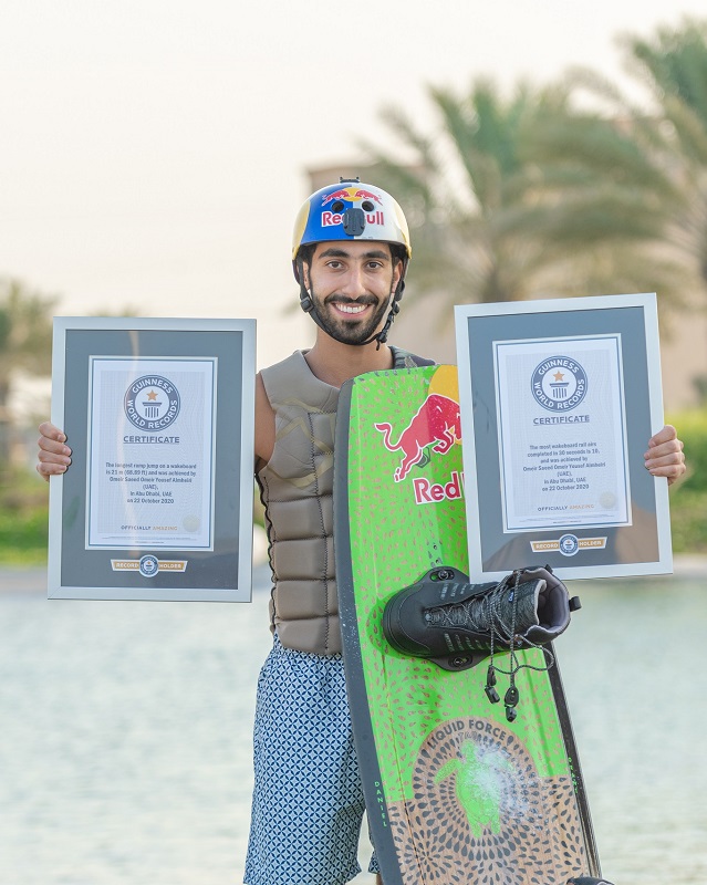 من جهته، استطاع البطل الإماراتي العالمي، عمير بن سعيد عمير يوسف المهيري، حصد لقبين عالميين تزامناً مع اليوم العالمي لـ"غينيس" للأرقام القياسية لأطول قفزة منحدر على لوح تزلج وأكثر عدد قفزات هوائية على زلاجة مائية خلال 30 ثانية، متفوقاً بفارق كبير على رقمي الفرنسي جيرومي ماكوارت الذي احتفظ بهما منذ عامي 2004 و2005 على التوالي.