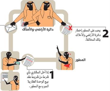 وقالت اللائحة إنه «إذا لم يقم المطور برد المبالغ المستحقة في الموعد، تقوم المؤسسة باتخاذ الإجراءات اللازمة لضمان حقوق المشترين، بما في ذلك إحالة الأمر إلى الجهات المختصة، كما أجازت اللائحة للمؤسسة رفض إلغاء عقود بيع الأراضي المباعة على الخارطة حفاظا على حقوق المشترين إذا رغب المطور في ذلك».