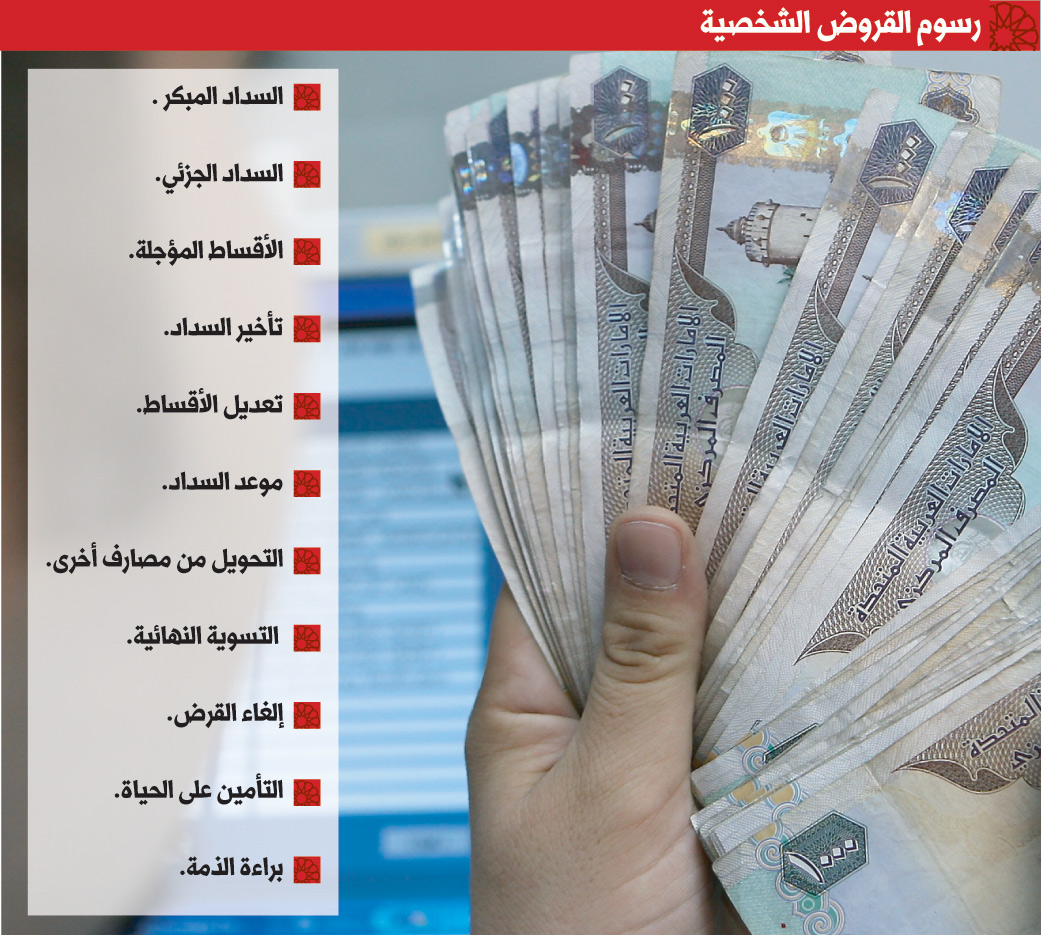 تفرض بنوك محلية 11 نوعاً من الرسوم على القروض الشخصية، بحسب رصد أجرته «الإمارات اليوم»، إذ تشترط البنوك على العميل الراغب في الحصول على قرض شخصي أو تمويل سداد، رسوماً إدارية، وأخرى للتأمين على الحياة ضماناً للقرض، إضافة إلى رسوم تسوية نهائية.