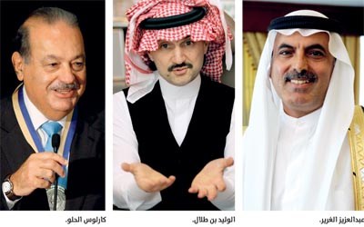عربياً، قالت المجلة إن الأمير الوليد بن طلال لايزال يتربع على المرتبة الأولى، والـ26 بين أثرياء العالم بثروة تقدر بـ72.1 مليار درهم (19.6 مليار دولار)، لترتفع ثروته خلال العام الماضي بنحو 700 مليون درهم، كما بات أكبر مساهم فرد في مجموعة «سيتي غروب» المصرفية الأميركية، فضلاً عن استثماره نحو 500 مليون دولار في اكتتاب «جنرال موتورز» نوفمبر الماضي، وتمتلك شركته المدرجة في السوق السعودية «المملكة القابضة» نحو 40٪ من الشركة التي تخطط لبناء أطول ناطحة سحاب في العالم بجدة. وجاء في المرتبة الثانية عربياً، والـ77 عالمياً، رجل الأعمال الكويتي ناصر الخرافي، بثروة تقدر بـ38.2 مليار درهم (10.4 مليارات دولار)، ثم رجل الأعمال السعودي سليمان الراجحي بثروة قدرتها المجلة بـ28.3 مليار درهم (7.7 مليارات دولار)، ليحل في المركز 120 عالمياً، تلاه السعودي محمد عيسي الجابر في المركز الرابع وبثروة 25.7 مليار درهم (سبعة مليارات دولار)، فيما حل رجل الأعمال المصري نصيف ساويراس في المرتبة الخامسة بثروة 20.6 مليار درهم (5.6 مليارات دولار).