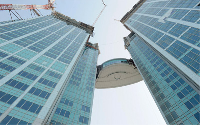 نجحت شركة «إنترناشيونال كابيتال تريدنغ»، المالكة لمشروع «نيشن تاورز» في أبوظبي، و«الشركة الوطنية للمشاريع والإنشاءات»، و«شركة أرابتك للإنشاءات»، اللتي تنفذ المشروع، في رفع أجزاء الجسر الحديدي الضخم الذي يزن أكثر من 400 طن، وتثبيته بين برجي المشروع.