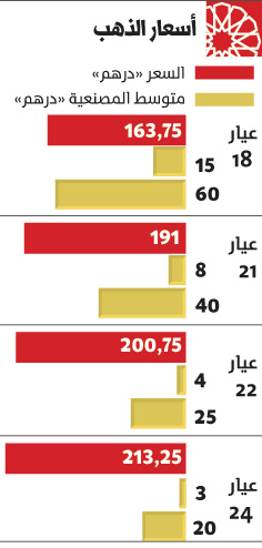 وبلغ سعر الغرام عيار «24» قيراطاً 213.25 درهماً مرتفعاً 2.25 درهم، فيما بلغ سعر الغرام عيار «22» قيراطاً 200.75 درهم بزيادة قدرها 2.25 درهم.