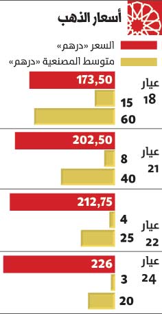 وبلغ سعر الغرام من عيار (21) قيراطاً 202.50 درهم، بزيادة تبلغ 75 فلساً، فيما بلغ سعر الغرام من عيار (18) قيراطاً 173.50 درهماً، مرتفعاً 50 فلساً، مقارنة بمؤشرات الأسعار أول من أمس.