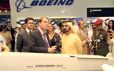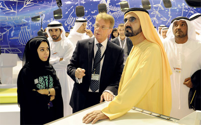 كما صعد سموه إلى طائرة «بوينغ 787» الجديدة، التي يطلق عليها طائرة «دريم لاينز»، وتعرف من القائمين عليها إلى مكونات وقدرات الطائرة العملاقة التي تتسع إلى نحو 250 راكباً. وتفقد سموه مجسماً للطائرة الكندية المدنية الواعدة التي ستطير للمرة الأولى في الأجواء في أواخر عام ،2013 وتعرض للمرة الأولى في «دبي الدولي للطيران 2011». ثم ولج سموه ومرافقوه الى صالة العرض الشرقية التي تضم بين جنباتها أجنحة ومنصات لشركات محلية وعالمية متخصصة في تقنيات الصناعات الجوية وتجهيز المطارات وأنظمة الدفاع الجوي الحديثة. وتوقف سموه في مستهل جولته الداخلية عند منصة عرض شركة «جنرال أتومكس» الأميركية المتخصصة في تقنيات الطيران والمطارات، وزار جناح مجموعة «بروينز غروب» الأسترالية، وأجنحة الصين، والسويد، وكوريا الجنوبية، وشركة «بوينغ» الأميركية، ثم جناح مؤسسة الإمارات للعلوم والتقنية المتقدمة التي تعرض القمر الاصطناعي الجديد «دبي سات 2»، الذي سيتم إطلاقه خلال عام ،2012 بعد إطلاق القمر الأول «دبي سات 1»، اللذين تم تصنيعهما بأيدٍ وعقول إماراتية بالتعاون مع جمهورية كوريا الجنوبية.