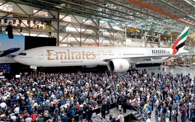 احتفلت «طيران الإمارات»، أكبر مشغل في العالم لطائرة «بوينغ 777»، أمس، بكشف النقاب عن الطائرة رقم 1000 من طراز «777» خلال حفل خاص أقيم في مركز شركة «بوينغ» في إيفريت بولاية واشنطن الأميركية، وستحمل الطائرة عندما تنضم إلى «طيران الإمارات» في وقت لاحق من الشهر الجاري الرقم ،102 من الطراز نفسه ضمن أسطول الناقلة.
