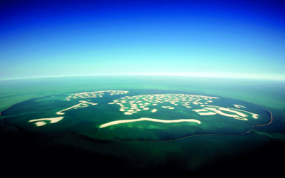 وكانت «العالم» أكملت بناء 300 جزيرة ضمن مشروع «جزر العالم»، ونحو 27 كيلومتراً من كاسر الأمواج في عام 2008، إذ تبلغ مساحة التطوير تسعة كيلومترات طولاً، وسبعة كيلومترات عرضاً، وتضيف 232 كيلومتراً من السواحل الشاطئية في دبي، واستخدمت أكثر من 320 مليون متر مكعب من الرمال لإنشاء 10 ملايين متر مربع من مساحة الأراضي المرتفعة من أجل التطوير، في حين أن 34 مليون طن من الصخور تشكل كاسر الأمواج الذي يحمي الجزر.