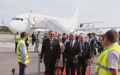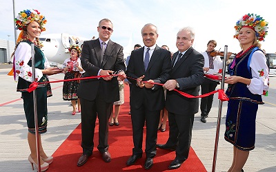 وصلت الرحلة الافتتاحية لـ«فلاي دبي» رقم «إف زد 727» إلى مطار زولياني الدولي في كييف، وتم إطلاق المدافع المائية ترحيباً بوصولها.