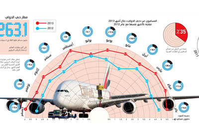 تفرّد مطار دبي الدولي بتحقيق نسبة نمو من خانتين في أعداد المسافرين، ضمن قائمة أكثر مطارات العالم ازدحاماً بالركاب الدوليين، بلغت 15.2% بعد أن تعامل المطار مع نحو 66.4 مليون مسافر في عام 2013، وتخطى عدد المسافرين في شهر ديسمبر الماضي حاجز الستة ملايين مسافر للمرة الأولى في تاريخ المطار.