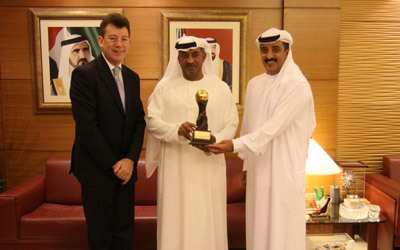 وتسلم الجائزة سمو الشيخ أحمد بن سعيد آل مكتوم، رئيس هيئة دبي للطيران المدني رئيس مطارات دبي، في مكتب سموه في مطار دبي، من النائب الأول التنفيذي للرئيس للشؤون الدولية والاتصال في مطارات دبي.