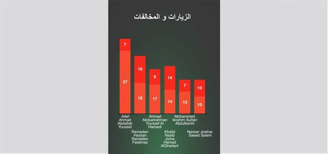 وأشار بوشهاب إلى أن «المعلومات التي يعرضها التطبيق هي إجمالي التقارير التي تم تحريرها من قبل المفتش وعدد المنشآت التجارية التي حدث المفتش بياناتها، فضلاً عن عدد الرخص التجارية التي تم الاستفسار عنها، إضافة إلى مواقع وجود المفتش، وعدد مرات تسجيل الدخول على نظام الميداني وعدد مرات تسجيل الخروج من النظام مع الوقت»، منوهاً بأنه «بوجود تلك المعلومات يمكن احتساب المدة الزمنية الفعلية لعمل المفتش». وأوضح أن «نظام تتبع سير عمل المفتشين يتضمن الاطلاع على تحركات المفتشين ومتابعة إنجازهم ميدانياً من خلال نظام (الخريطة الذكية)»، لافتاً إلى أنه «يتابع الإنجاز اليومي للمفتشين لضمان جودة التفتيش وصدقية التقارير التي تم تحريرها ميدانياً من قبل المسؤول المباشر وقسم رقابة الأداء الميداني، إضافة إلى التأكد من التزام المفتشين بمناطق التفتيش». وقال بوشهاب إن «الخريطة توضح أماكن وجود المفتشين، إذ توجد علامات تحدد حالة التقرير الذي حرره المفتش، وذلك على أربع نقاط في صورة دوائر ملونة»، موضحاً أن «الدائرة الزرقاء، تدل على تحركات المفتشين من دون تحرير زيارة التفتيش، أما الدائرة الخضراء، تدل على تحرير زيارة تفتيشية حسب النظام مثل تحرير زيارة تفتيش في الموقع الفعلي للرخصة التجارية».