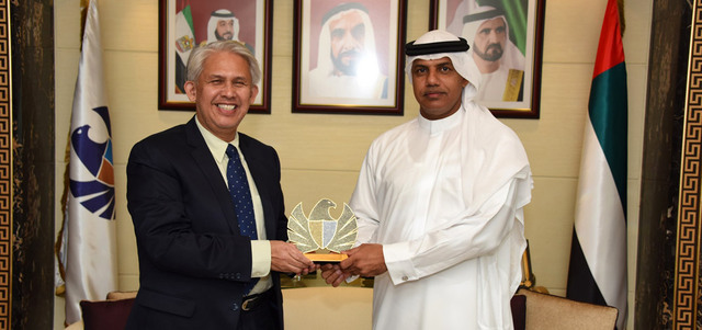 مصبح (يمين) خلال استقباله قنصل عام إندونيسيا في الدولة. من المصدر