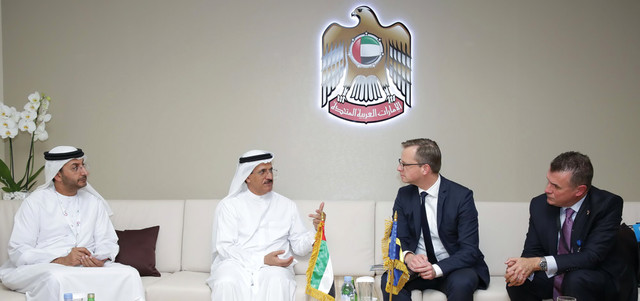 المنصوري خلال لقائه وزير المشاريع والابتكار بمملكة السويد ميكائيل دامبرج. من المصدر