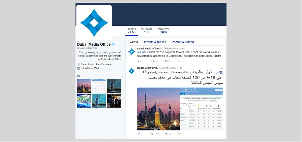 وذكر المكتب الإعلامي لحكومة دبي من خلال صفحته الرسمية على موقع التواصل الإجتماعي "تويتر"، أن دبي هي الاولى عالميا في عدد ناطحات السحاب في العالم، بحسب مجلس المباني الشاهقة.