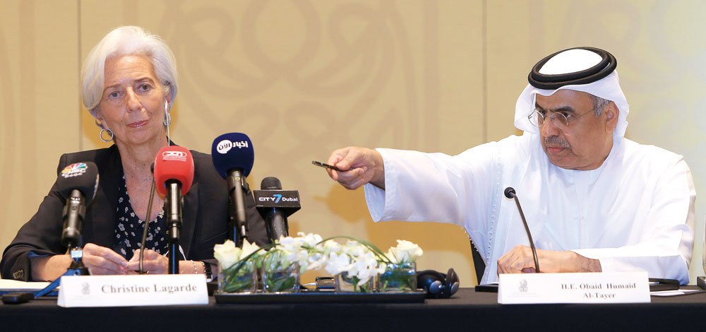 كريستين لاغارد تتحدث في المؤتمر الصحافي بحضور عبيد الطاير. تصوير: باتريك كاستيلو