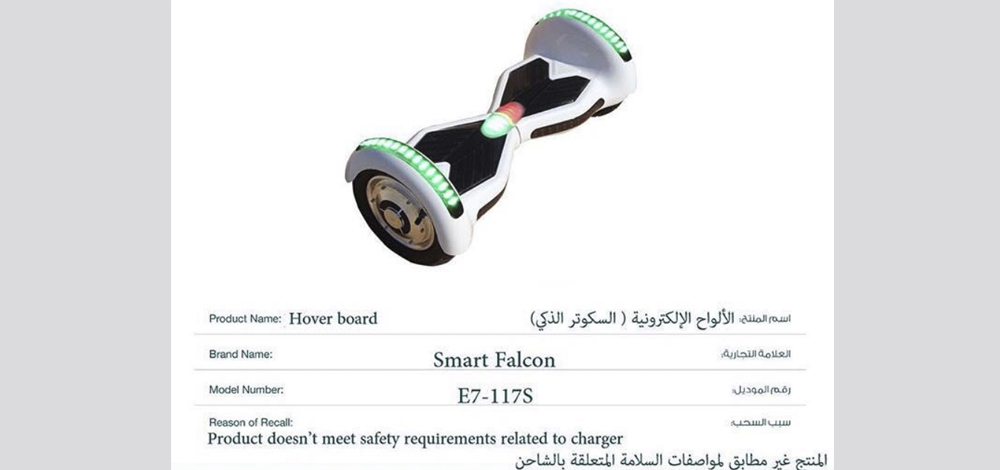سحبت "أبوظبي للجودة والمطابقة" السكوتر الذكي الذي يحمل علامة "Smart Falcon" التجارية من أسواق الإمارة بعد أن تبين أنه غير مطابق لمواصفات السلامة المتعلقة بالشاحن، ما قد يؤدي إلى تسبب حريق عند توصيله بمأخذ شاحن البطارية.