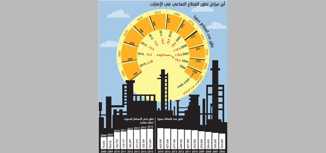 وأضاف أن «إجمالي قيمة الاستثمارات الصناعية بالدولة، خلال العام الماضي، بلغ 127 ملياراً و609 ملايين درهم، مقارنة بمبلغ 125 ملياراً و189 مليون درهم خلال عام 2014»، مبيناً أن «الأرقام الحالية تدل على مدى تطور الاستثمارات الصناعية في الدولة، والتي كانت قيمتها خلال عام 2008 لا تتجاوز 74 ملياراً و464 مليون درهم».