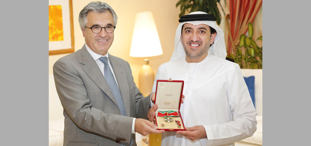 الشحي يتسلّم قلادة «نجمة إيطاليا» من السفير الإيطالي. وام