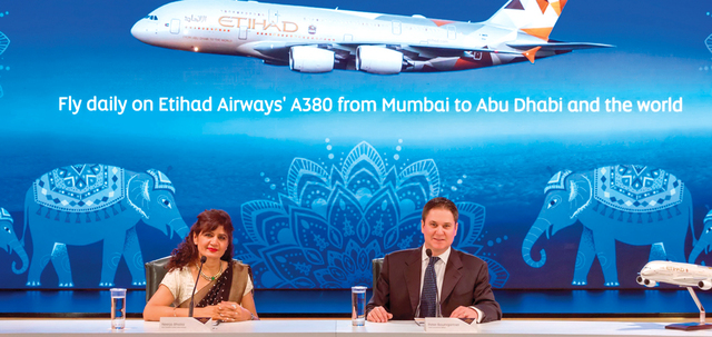أكدت شركة «الاتحاد للطيران» أن الهند جزء حيوي من استراتيجية النمو التي تتبعها الشركة، لافتة إلى أنها أطلقت رحلات يومية بالطائرة «إيرباص A380» إلى مدينة مومباي. وأكدت الشركة أن عدد المسافرين بين الهند وأبوظبي وصل، عبر شبكات «الاتحاد للطيران» و«غيت آيروايز»، في إطار اتفاقية الشراكة بينهما، إلى 3.3 ملايين مسافر العام الماضي.