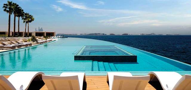ويتميز الحوضان بتصميمهما الذي يدمجهما بأفق مياه الخليج العربي، ما يعطي انطباعاً خلّاباً بأن مياه الخليج تمثل امتداداً لمياه المسبح، فيما يتميز حوضا السباحة بتصميمها الفريد الذي تزينه 10 ملايين وحدة من وحدات «الموزاييك» بتدرجات اللون الأزرق المائي، مع خطوط ذهبية اللون، تعطي لمسة ساحرة للتصميم، ليتكامل هذا التكوين الجمالي مع روعة شواطئ «التيراس»، المميزة برمالها البيضاء الناعمة.