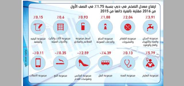 وتفصيلاً، كشف تقرير لمركز دبي للإحصاء عن ارتفاع مؤشر الرقم القياسي لأسعار المستهلك بنسبة 1.75%، في النصف الأول من عام 2016، مقارنة بالفترة ذاتها من عام 2015، مرجعاً ذلك إلى ارتفاع الرسوم الدراسية التي أثرت في ارتفاع مؤشر مجموعة التعليم بنسبة 5.79%، حيث بلغت أهميتها النسبية 4.09% من إجمالي سلة المستهلك.