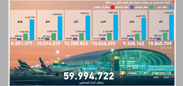 للإطلاع على أعداد المسافرين عبر مطارات الدولة خلال النصف الاول من 2016 يرجى الضغط على هذا الرابط.