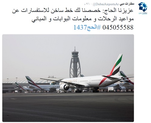 قالت مطارات دبي عبر حسابها الرسمي بموقع التواصل الإجتماعي "تويتر"، إنها خصصت خطاً ساخناً للمسافرين الحجاج، للاستفسار عن مواعيد الرحلات ومعلومات البوابات والمباني، وهو على الرقم التالي 045055588.