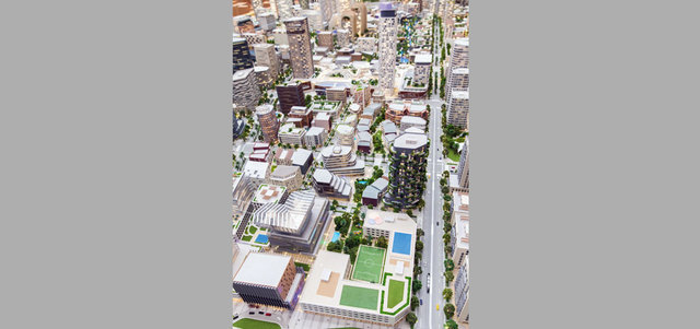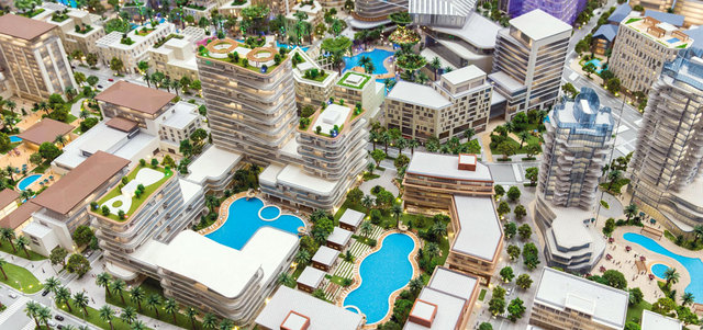 وتضم 3000 وحدة سكنية موزعة على 13 مبنى سكنياً، إضافة إلى 2800 غرفة فندقية موزعة على 14 فندقاً، كما تشتمل على صالة معارض، ومسرح، ومبانٍ ثقافية، و12 مبنى تجارياً، وخمس حدائق، وثلاث محطات «ترام»، ويخدمها 15 ألف موقف سيارة.
