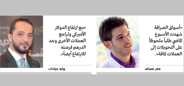 وأوضح عساف أن «أهم العملات التي شهدت ارتفاعاً في الطلب عليها الدولار الأميركي، تلاه الجنية الإسترليني، ثم اليورو»، لافتاً إلى أن «الدرهم ارتفع الجمعة الماضي مقابل سلة من العملات، أهمها اليورو والإسترليني، بعد بيانات في السوق الأميركية أظهرت زيادة أكثر حدة من المتوقع في مؤشر أسعار المستهلك ومؤشر التضخم الرئيس بالولايات المتحدة».