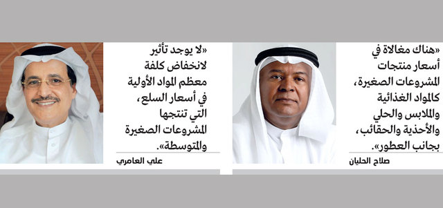 في السياق نفسه، قال الخبير الاقتصادي، علي العامري، إنه «لا يوجد تأثير لانخفاض أسعار معظم المواد الأولية تأثراً بسعر النفط، في أسعار السلع والمنتجات بما فيها السلع التي تنتجها المشروعات الصغيرة والمتوسطة»، لافتاً إلى أنه رغم هذا الانخفاض في أسعار بعض المواد الأولية، فإن ارتفاع القيم الايجارية والأيدي العاملة والرسوم الحكومية لعب دوراً رئيساً في ارتفاع أسعار منتجات المشروعات الصغيرة. وأضاف أن هناك بعض المواد، خصوصاً في مجال الصناعة، ارتفعت أسعارها في السوق العالمية، مثل الحديد، رغم انخفاض أسعار البترول.