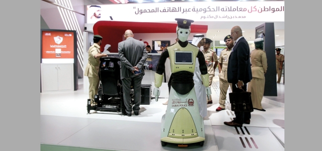 شرطة دبي عرضت خلال المعرض نموذجأ لـ«روبوت» سيدخل الخدمة العامة قبل تنظيم معرض «إكسبو 2020 دبي». تصوير: أشوك فيرما