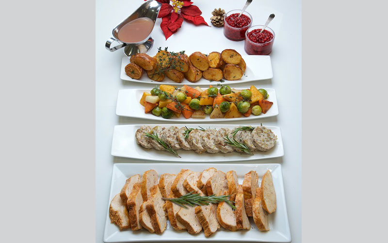وتشمل الوجبات على الطائرات شرائح الديك الرومي المشوية والبطاطا المهروسة والقرع المهروس والخضار الطازجة وانواع الكعك الخاصة، بالإضافة إلى الشوكولاتة الفاخرة، ما يجسد رؤية طيران الإمارات والتزامها تقديم قوائم طعام إقليمية وموسمية باستخدام مكونات طازجة ذات جودة عالية عبر شبكة رحلاتها العالمية.