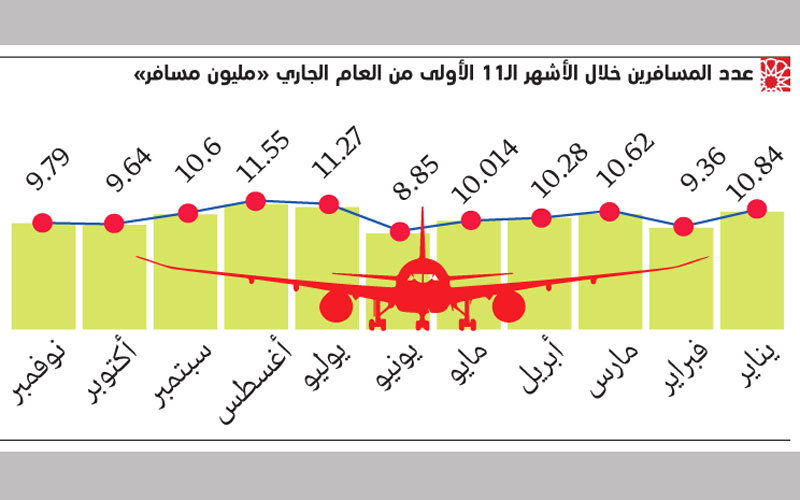 112.8 مليون مسافر عبر مطارات الدولة في 11 شهراً