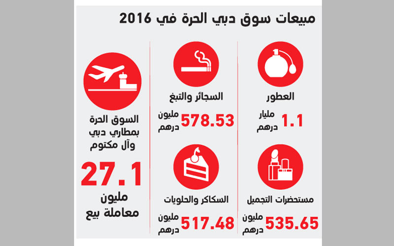 وواصلت العطور تصدرها قائمة السلع الأكثر مبيعاً، حيث سجلت مبيعاتها السنوية 1.1 مليار درهم (306.85 ملايين دولار)، بنسبة 16.55% من إجمالي المبيعات السنوية، فيما حلت مبيعات السجائر والتبغ في المركز الثاني، محققة 578.53 مليون درهم (160.7 مليون دولار)، ومستحضرات التجميل في المركز الثالث، بمبيعات وصلت إلى 535.65 مليون درهم (148.8 مليون دولار) والسكاكر والحلويات في المرتبة الرابعة بقيمة 517.48 مليون درهم (143.75 مليون دولار). وسجلت مبيعات صالات «المغادرون» التي تشكل 86% من إجمالي المبيعات السنوية 5.782 مليارات درهم (1.6 مليار دولار). ونفذت السوق في مطاري دبي وآل مكتوم الدوليين نحو 27 مليوناً و119 ألف معاملة بيع في 2016، بمعدل 74 ألفاً و97 معاملة بيع يومية.
