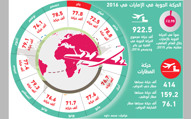 أفادت الهيئة العامة للطيران المدني بنمو الحركة الجوية في الإمارات، بنسبة 2.95%، خلال العام الماضي، مقارنة بعام 2015، لافتة إلى أن مجموع الحركة الجوية في الفترة بين يناير وديسمبر من عام 2016 وصل إلى 922 ألفاً و510 حركات، مقارنة بـ896 ألفاً و112 حركة خلال الفترة ذاتها من عام 2015.