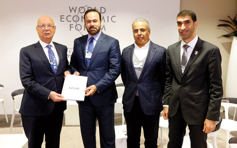 محمد القرقاوي يسلّم نسخة من التقرير لمؤسس ورئيس المنتدى الاقتصادي العالمي «دافوس»، كلاوس شواب. من المصدر