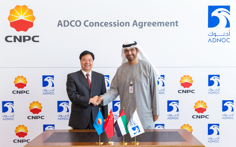 وقعت شركة بترول أبوظبي الوطنية «أدنوك»، أمس، اتفاقية امتياز مع الشركة الوطنية الصينية للبترول بنسبة 8% في حقول أبوظبي النفطية البرية، التي تديرها شركة أبوظبي للعمليات البترولية البرية «أدكو»، مقابل رسم مشاركة يبلغ 6.5 مليارات درهم (1.776) مليار دولار.