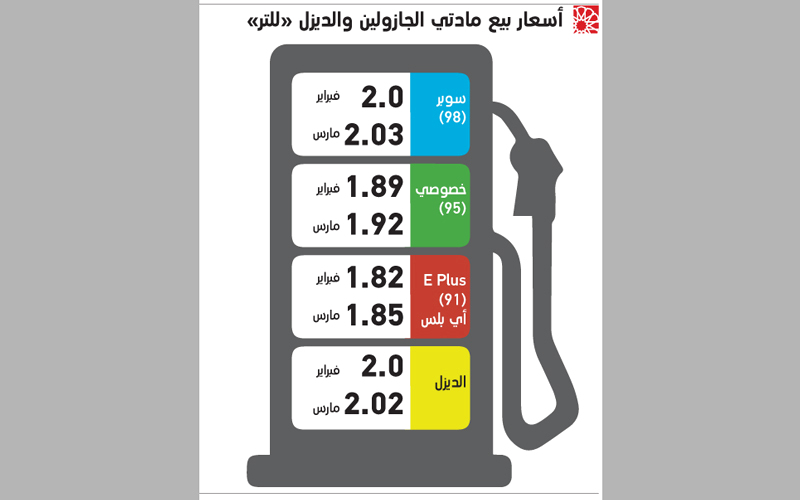 وأضافت أن سعر لتر وقود جازولين «خصوصي 95» سيبلغ 1.92 درهم مقابل 1.89 درهم خلال فبراير 2017، بزيادة قيمتها ثلاثة فلوس وارتفاع نسبته 1.58%، فيما يرتفع سعر لتر جازولين «إي بلس 91» إلى 1.85 درهم مقابل 1.82 درهم خلال فبراير، بزيادة قيمتها ثلاثة فلوس كذلك ونسبتها 1.65%. أما وقود الديزل، فسيشهد ارتفاعاً نسبته 1%، يعادل فلسين للتر، ليسجل سعر بيعه 2.02 درهم، مقارنة مع درهمين خلال فبراير الجاري.