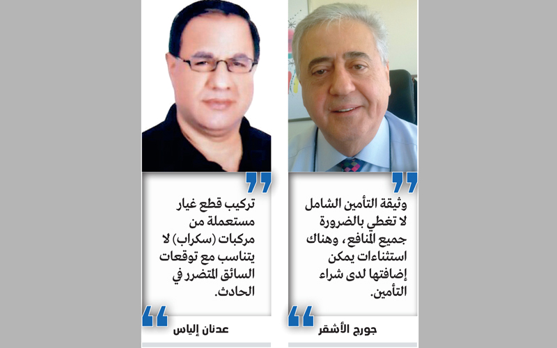 في سياق متصل، قال المدير العام لشركة «غيت ويه إنترناشيونال أشورنس» (وكلاء تأمين)، جورج الأشقر، إن «وثيقة التأمين على المركبات تنص على إرجاع السيارة إلى وضعها السابق قبل الحادث»، مضيفاً أنه «بالنسبة للمركبات المؤمنة تأميناً شاملاً خارج الوكالة يتم تركيب قطع غيار مستعملة بالنسبة للمتسبب في الحادث أو المتضرر، وفي حال أراد أحد الطرفين تركيب قطع غيار جديدة فإنه سيتحمل نسبة استهلاك تصل إلى 5%». وذكر الأشقر أن «الوثيقة لا تفصل في هذه الحالة بين المتسبب في الحادث أو المتضرر منه»، مشدداً على أهمية تحديد معايير جودة لورش الصيانة والتصليح لتقليل حجم الشكاوى، والتأكد من أن المتعامل يحصل على خدمات جيدة.