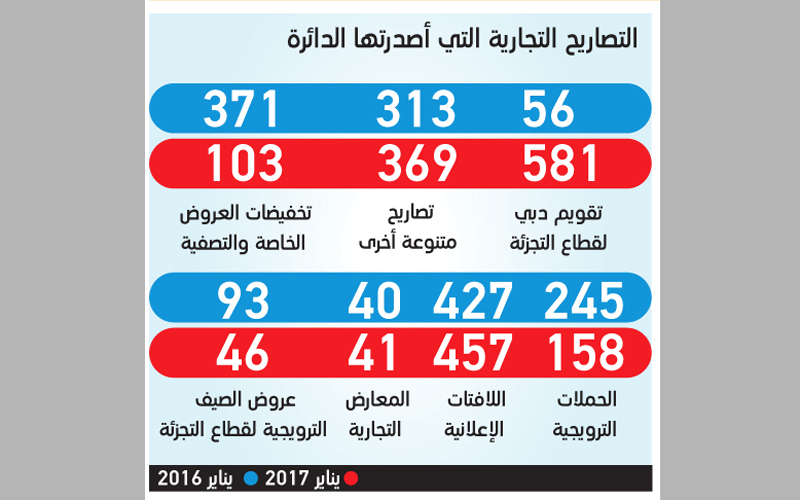 وكشفت إحصاءات للدائرة، حصلت «الإمارات اليوم» على نسخة منها، أن الحملات الترويجية استحوذت على 158 تصريحاً، والتخفيضات والعروض الخاصة والتصفية على 103 تصاريح، بينما شكلت اللافتات الإعلانية 457 تصريحاً، والتصاريح المتنوعة 369 تصريحاً، في حين بلغ عدد تصاريح المعارض التجارية 41 تصريحاً.